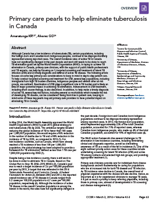 Amaratunga KR, Alvarez GG. Primary care pearls to help eliminate tuberculosis in Canada. Can Comm Dis Rep 2016;42:63-7. https://doi.org/10.14745/ccdr.v42i03a03