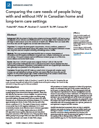 Nevertheless, the over-representation of data from Ontario and the variability of interRAI uptake across Canada are important limitations. Also, these findings cannot be compared to PHAs who do not access such care or who access AIDS/HIV-specific care from other care settings. Finally, this cross-sectional work could not determine causal relationships.