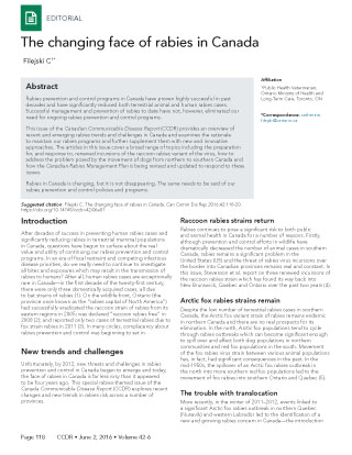 Filejski C. The changing face of rabies in Canada. Can Comm Dis Rep 2016;42:118-20. https://doi.org/10.14745/ccdr.v42i06a01