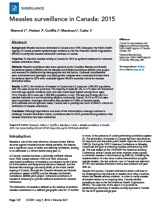 Conclusion: Although importations and areas of low immunization coverage continue to challenge Canada’s elimination status, surveillance data for 2015 provides strong evidence that measles elimination has been maintained.