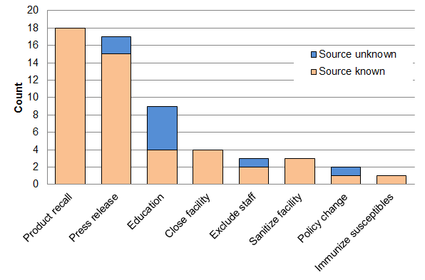 An intervention was defined as public health action intended to eliminate or decrease exposure to the source of an outbreak or decrease an individual’s susceptibility to infection. Types of interventions included actions on facilities (closure, staff exclusion, sanitization) as well as education, immunization, policy changes, press releases and product recalls.