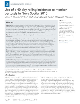 Born J, Coombs A, Ryan V, LaFreniere M, Earle L, Fleming S, Fitzgerald A, Atherton F. Use of a 40-day rolling incidence to monitor pertussis in Nova Scotia, 2015. Can Commun Dis Rep. 2017;43(2):49-55. https://doi.org/10.14745/ccdr.v43i02a03