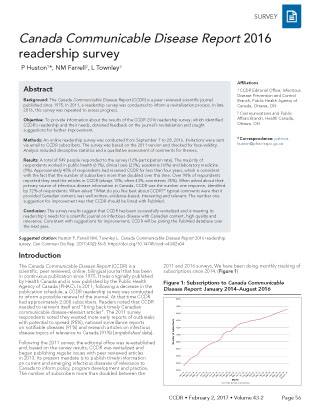 Huston P, Farrell NM, Townley L. Canada Communicable Disease Report 2016 readership survey. Can Commun Dis Rep. 2017;43(2):56-8. https://doi.org/10.14745/ccdr.v43i02a04