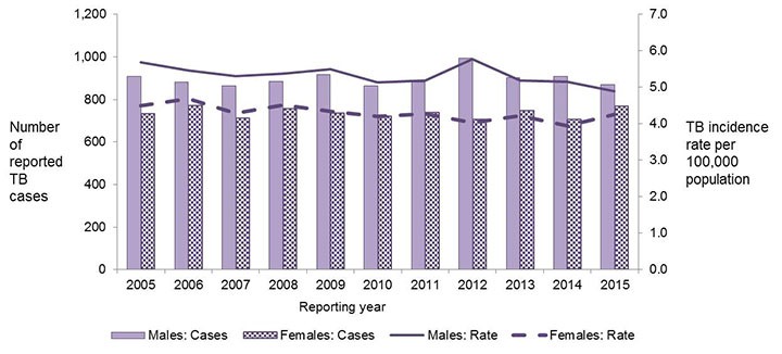 Figure 3: Number of reported active tuberculosis cases (new and re-treatment) and incidence rates per 100,000 population by sex in Canada, 2005 to 2015