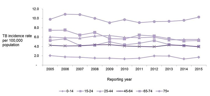 Between 2005 and 2015, TB incidence rates have remained stable or have declined slightly across all age groups (Supplementary Table 2 Footnote 5; Figure 4). The most noticeable decrease in incidence rates has been in individuals 65 to 74 years of age, ranging from a high of 7.5 per 100,000 population in 2005 to a low of 5.2 per 100,000 population in 2014. As in previous years, in 2015, older adults (75 years and over), carried the highest disease burden with an incidence rate of 10.3 per 100,000 population. See additional data in Supplementary Table 2 Footnote 5.