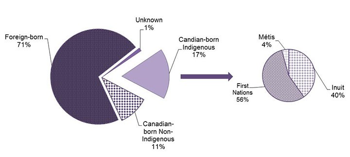Foreign-born individuals and Canadian-born Indigenous people continued to be disproportionately represented among reported cases of TB in 2015 (Figure 6). The foreign-born population, which represented approximately 22% of the total Canadian population in 2015, accounted for 71% (1,169/1,639) of all reported cases corresponding to an incidence rate of 14.8 per 100,000 population. Canadian-born Indigenous people made up approximately five percent of the total Canadian population in 2015 but accounted for 17% (281/1,639) of all reported cases, with a corresponding incidence rate of 17.1 per 100,000 population. Canadian-born non-Indigenous people accounted for the lowest percentage of reported cases at 11% (170/1,639), for an incidence rate of 0.6 per 100,000 population. Origin was unknown for 1% (19/1,639) of reported cases (Figure 6, Supplementary Table 4 Footnote 5).