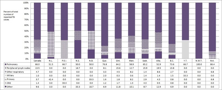 Between 2005 and 2015, respiratory disease accounted for 76% (13,745/17,975) of all diagnosed TB cases in Canada (Supplementary Table 5 Footnote 5). In 2015, 66% of reported cases were diagnosed with pulmonary TB. Pulmonary disease was the most frequently reported diagnostic classification in all provinces and territories. Peripheral lymph node TB remained the second most frequently reported diagnostic site. Overall, four percent (60) of reported cases were diagnosed with primary TB. However, 42% (1433) of the cases reported from Newfoundland and Labrador were diagnosed with primary TB (Figure 8). See additional data in Supplementary Table 6 Footnote 5.