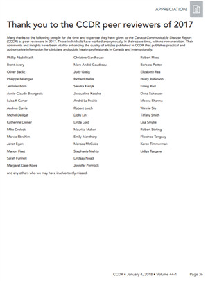 Many thanks to the following people for the time and expertise they have given to the Canada Communicable Disease Report (CCDR) as peer reviewers in 2017. These individuals have worked anonymously, in their spare time, with no remuneration. Their comments and insights have been vital to enhancing the quality of articles published in CCDR that publishes practical and authoritative information for clinicians and public health professionals in Canada and internationally.