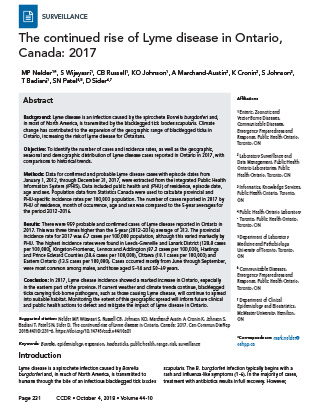 Nelder MP, Wijayasri S, Russell CB, Johnson KO, Marchand‑Austin A, Cronin K, Johnson S, Badiani T, Patel SN, Sider D. The continued rise of Lyme disease in Ontario, Canada: 2017. Can Commun Dis Rep 2018;44(10):231-6. https://doi.org/10.14745/ccdr.v44i10a01