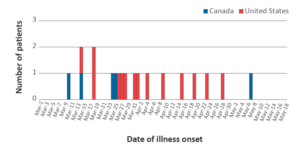 The figure above is a histogram showing the number of persons infected with the outbreak strain of Salmonella Chailey (n=19), by date of illness onset in the United States and Canada during March–May 2017.