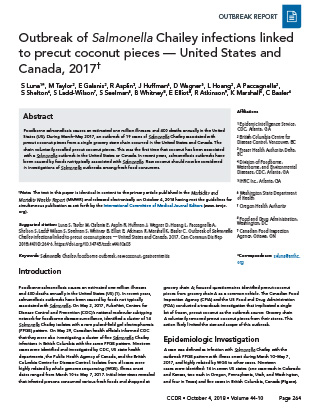 Luna S, Taylor M, Galanis E, Asplin R, Huffman J, Wagner D, Hoang L, Paccagnella A, Shelton S, Ladd‑Wilson S, Seelman S, Whitney B, Elliot E, Atkinson R, Marshall K, Basler C. Outbreak of Salmonella Chailey infections linked to precut coconut pieces — United States and Canada, 2017. Can Commun Dis Rep 2018;44(10):264-6. https://doi.org/10.14745/ccdr.v44i10a05
