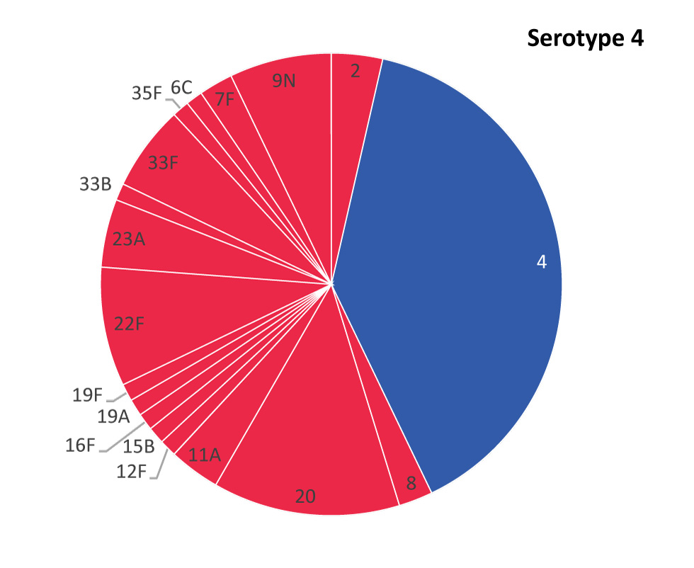 Serotype 4 cases generally reported fewer co-morbidities than other serotypes, with significant differences in cardiovascular disease, renal disease and diabetes. No significant differences in clinical presentation or hospital and Intensive Care Unit admission were observed; however, while 10 in-hospital deaths were reported among the non-serotype 4 cases, no in-hospital deaths were reported among the serotype 4 cases.