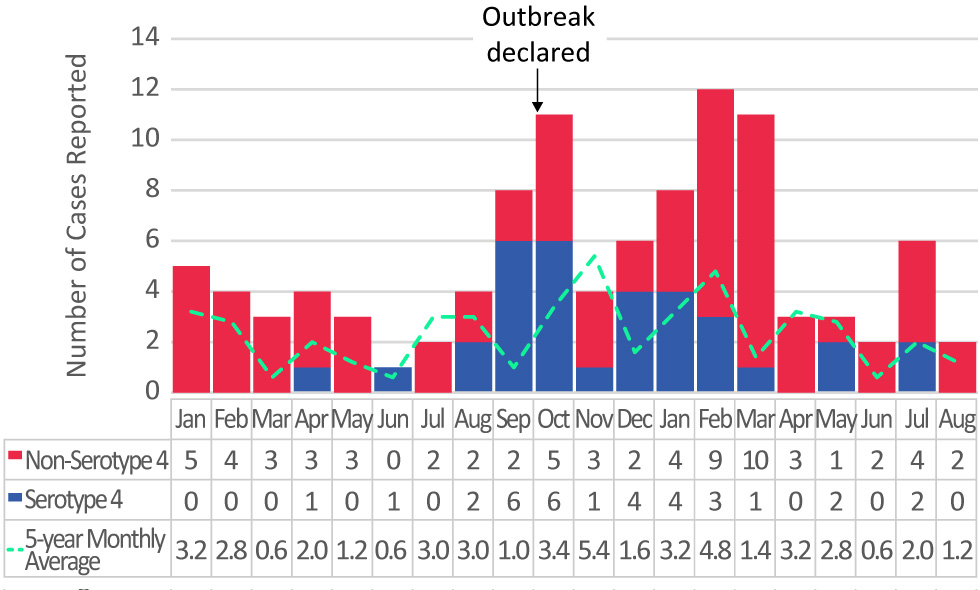 Case report forms were expanded with additional risk factor variables not previously collected, including housing status and substance use. Although patients were not directly contacted to obtain additional information, a retrospective chart review was conducted using electronic health records from public health encounters, emergency room visits, hospital admissions, outpatient investigations, and mental health and substance use clinical profiles. Case charts were reviewed by two authors (GM and AC) and data was coded based on standardized definitions (Appendix 1). Cases were stratified by serotype (serotype 4 vs. non-serotype 4) for descriptive analysis in Excel. Continuous variables were compared using a non-paired Student’s t test assuming unequal variance. Categorical variables were compared using a χ2 or Fisher’s exact test, depending on cell size. Unadjusted odds ratios were calculated using logistic regression in R statistical software (R Foundation, Vienna, Austria).