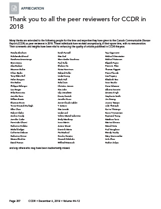 Many thanks are extended to the following people for the time and expertise they have given to the Canada Communicable Disease Report (CCDR) as peer reviewers in 2018. These individuals have worked anonymously, in their spare time, with no remuneration. Their comments and insights have been vital to enhancing the quality of articles published in CCDR this year.