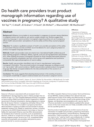 Top KA, Arkell C, Graham JE, Scott H, McNeil SA, Mannerfeldt J, NE MacDonald. Do health care providers trust product monograph information regarding use of vaccines in pregnancy? A qualitative study. Can Commun Dis Rep 2018;44(6):134-8. https://doi.org/10.14745/ccdr.v44i06a03