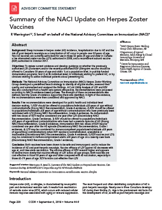 Warrington R, Ismail S. Summary of the NACI Update on Herpes Zoster Vaccines. Can Commun Dis Rep 2018;44(9):220-5. https://doi.org/10.14745/ccdr.v44i09a06