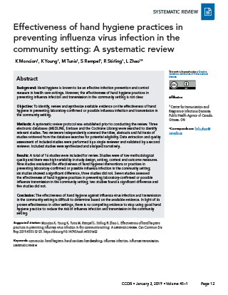 Moncion K, Young K, Tunis M, Rempel S, Stirling R, Zhao L. Effectiveness of hand hygiene practices in preventing influenza virus infection in the community setting: A systematic review. Can Commun Dis Rep 2019;45(1):12-23. https://doi.org/10.14745/ccdr.v45i01a02