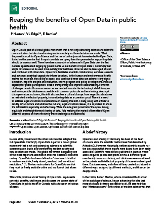Huston P, Edge VL, Bernier E. Reaping the benefits of Open Data in public health. Can Commun Dis Rep 2019;45(10):252–6. https://doi.org/10.14745/ccdr.v45i10a01