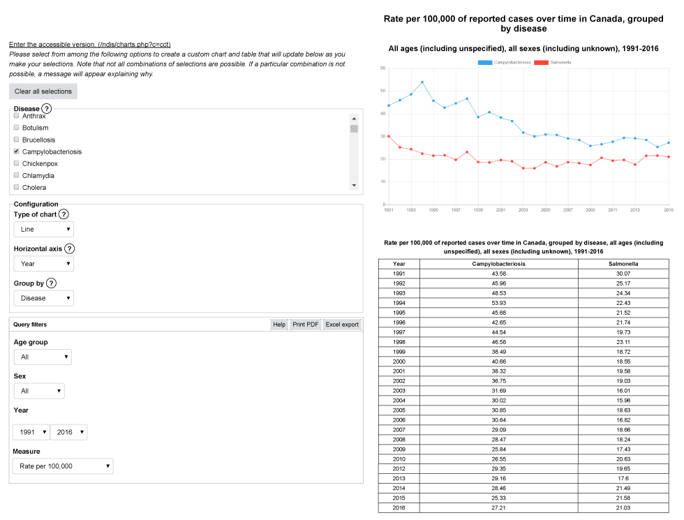 Since its relaunch in 2013, annual updates have included improvements to the look and feel of the NDO interactive site. In 2017, a function was added for users to download their query and the resulting online data into a PDF or in a Microsoft Excel spreadsheet. In 2018, a new custom charts function was introduced that includes a variety of options for data outputs. For example, to obtain a simple chart of national trends for campylobacter and salmonella infections between 1991 and 2016, a user can simply identify these two diseases and the time period of interest, and a graph showing trends over time will automatically be created (Appendix 1a). Custom charts can also be created according to specifications (i.e. axis definitions and variable groupings), and filters can be applied as needed (i.e. by age group, sex and year). The benefits of customization include the ability to visualize data for multiple diseases, age groups and sex categories, according to user needs (Appendix 1b). Both simple and custom charts can then be exported into a PDF or Excel format.