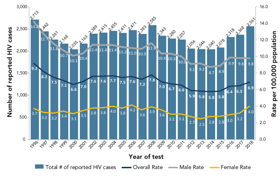 Since 2009, the diagnosis rates for males and females have fluctuated. For males, there has been a slight decrease since 2009 (10.4 per 100,000 population in 2009 to 9.8 per 100,000 population in 2018). For females, the rate of HIV diagnoses has fluctuated between 2.5 and 4.2 per 100,000 population since 1996. In the last five years, the rate increased: 2.5 in 2013, 3.2 in 2017 and 4.0 in 2018, always per 100,000 population.