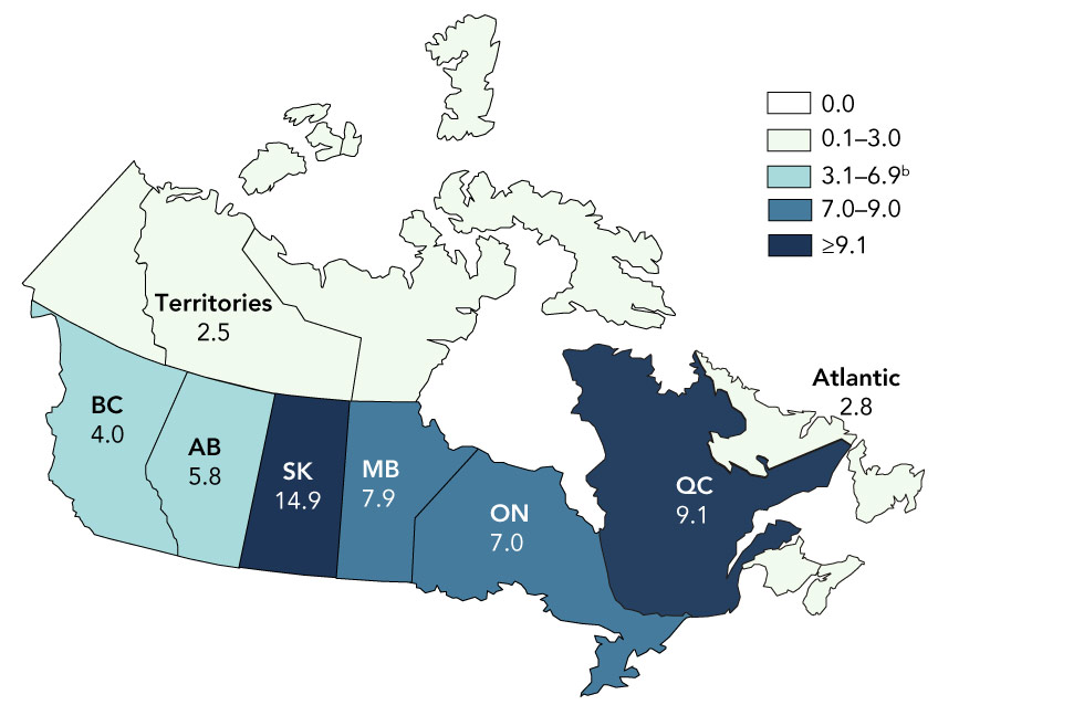 Figure 2: HIV diagnosis rate (per 100,000 population) by province and territory, Canada, 2018Figure 2 footnote a