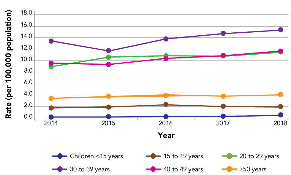 Accordingly, the 30–39 year age group had the highest rate of reported HIV cases at 15.4 per 100,000 population (Figure 3). The 40–49 year age group had the second highest rate at 11.7 per 100,000 population, followed by the 20–29 year age group at 11.5 per 100,000 population. The 20–29 year and 40–49 year age groups have had similar rates since 2016. Overall, the diagnosis rates for children (less than 15 years of age), the 15–19 year age group, and those who are 50 years of age or older remained relatively stable over the last five years.