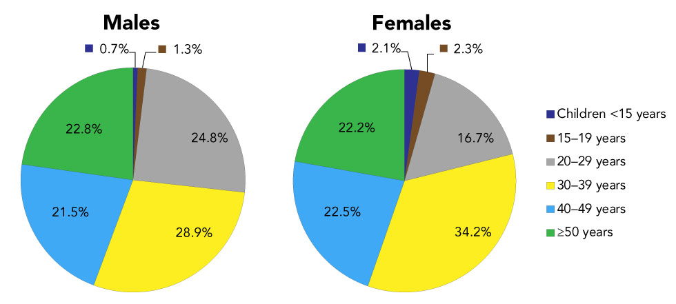 In 2018, data on age groups were available for nearly 100% (n=2,558) of all reported HIV cases. The 30–39 year age group continued to have the highest number and proportion of reported HIV cases (n=778, 30.4%), which is similar to 2017. The ≥50 and 20–29 year age group presented the second highest proportion of reported HIV cases at 22.5% for each age group (n=576 and n=575, respectively). This was followed by the 40–49 year age group (n=559, 21.9%). The 15–19 age group and children (less than 15 years of age) represented 1.6% and 1.1% of new HIV diagnoses, respectively.