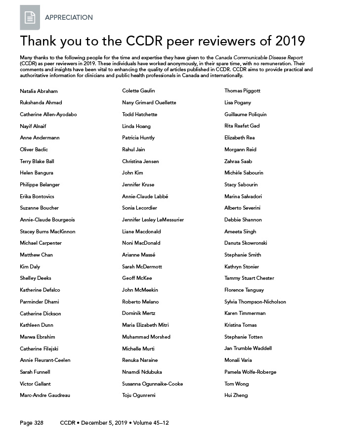 Many thanks to the following people for the time and expertise they have given to the Canada Communicable Disease Report (CCDR) as peer reviewers in 2019. These individuals have worked anonymously, in their spare time, with no remuneration. Their comments and insights have been vital to enhancing the quality of articles published in CCDR. CCDR aims to provide practical and authoritative information for clinicians and public health professionals in Canada and internationally.