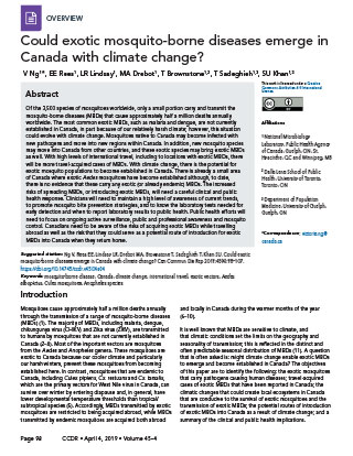 Ng V, Rees EE, Lindsay LR, Drebot MA, Brownstone T, Sadeghieh T, Khan SU. Could exotic mosquito-borne diseases emerge in Canada with climate change? Can Commun Dis Rep 2019;45(4):98–107. https://doi.org/10.14745/ccdr.v45i04a04