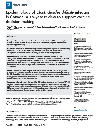 Xia Y, Tunis MC, Frenette C, Katz K, Amaratunga K, Rhodenizer Rose S, House A, Quach C. Epidemiology of Clostridioides difficile infection in Canada: A six-year review to support vaccine decision-making. Can Commun Dis Rep 2019;45(7/8):191–211. https://doi.org/10.14745/ccdr.v45i78a04