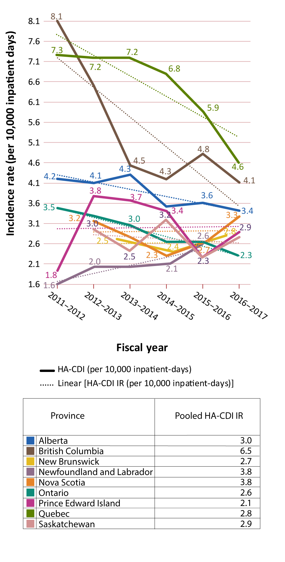 The HA-CDI incidence rates by year and province and pooled HA-CDI incidence rates are presented in Table 1 with additional detail in Appendix B. The HA-CDI incidence rates by year indicated that, for almost all provinces, trendlines had been decreasing. In contrast, rates in Newfoundland and Labrador had been increasing, rates in Prince Edward Island had been rising slightly and no obvious trends were seen for New Brunswick and Nova Scotia. Pooled HA-CDI incidence rates showed that Quebec and British Columbia had relatively higher rates, at 6.5/10,000 and 5.3/10,000 inpatient-days, respectively, followed by Alberta (3.8/10,000 inpatient-days) and Prince Edward Island (3.0/10,000 inpatient-days) (Appendix C: Figure C-1). The other provinces (Ontario, Nova Scotia, Saskatchewan, New Brunswick and Newfoundland and Labrador) each had rates of less than 3/10,000 inpatient-days