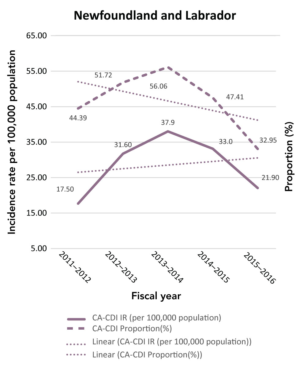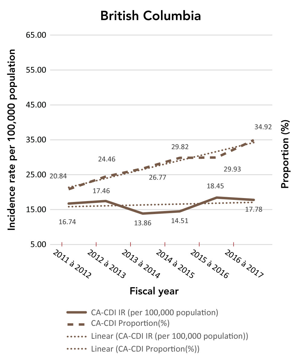 On the other hand, despite the possibility of an actual increase in CDI cases, the increased incidence rates could be partly explained by the evolution of circulating strains, which might lead to increased toxigenic potential and survival of the bacteria, or to improvements in surveillance and reporting in the province. Notwithstanding the slightly increasing trend in New Brunswick and Nova Scotia, there were only three years of data available for New Brunswick and only the fourth quarter of 2011–2012 fiscal year data available for Nova Scotia, decreasing our power to conclude on trends of HA-CDI incidence rate in these two provinces.