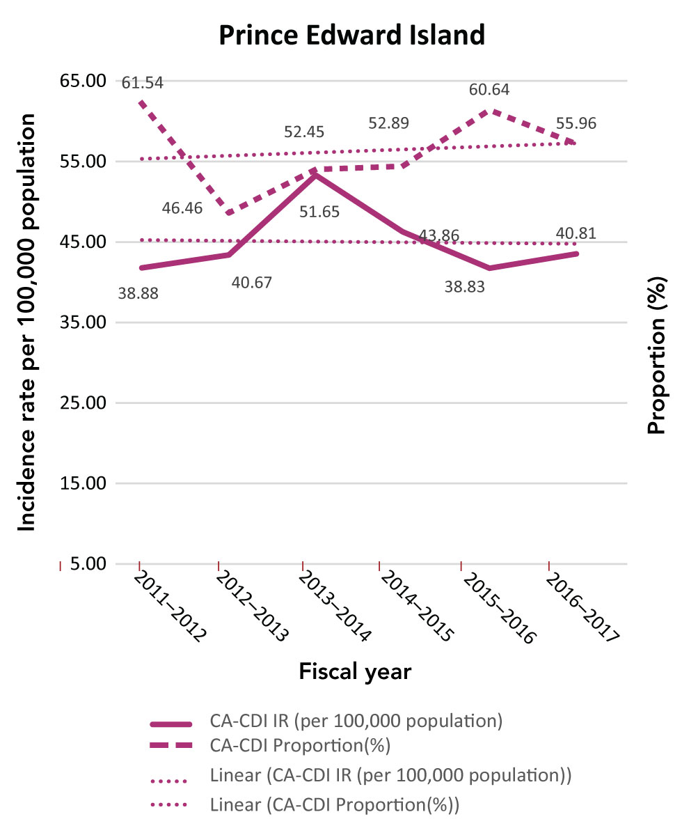 The CA-CDI incidence rates and CA-CDI proportions for provinces are presented in Table 2 with additional detail in Appendix B. In contrast to the HA-CDI incidence rates trends, the CA-CDI incidence rates of all five provinces examined (with the exception of Prince Edward Island) increased (Appendix C: Figure C-2). For Newfoundland and Labrador and Prince Edward Island, there were marked increases in CA-CDI incidence rates from 2012–2013 to 2014–2015. The same trend was also seen for CA-CDI proportions in British Columbia and Quebec. Even though the CA-CDI proportions in Newfoundland and Labrador were declining over the time period of the study, and the proportion seemed to be increasing in Prince Edward Island, the overall CA-CDI case counts in both provinces still represented a large portion of the total CDI cases reported.