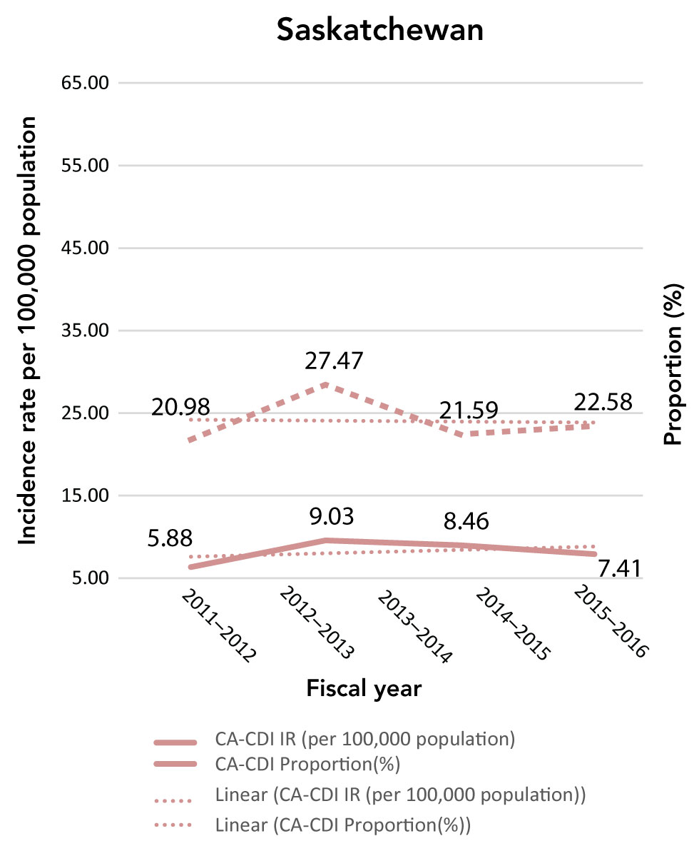 Even though most CA-CDI cases were reported in admitted patients, trends, not absolute rates, were studied in this article. Therefore, choosing the provincial population or admissions as the denominator had only a minor impact on the results. The five provinces included in the analysis of CA-CDI incidence rates showed a slight, increasing trend. Of the nine provinces, almost all focused only on HA-CDI. However, the observation of these trends in HA-CDI indicated the importance of also monitoring and analyzing CA-CDI in future surveillance activities. Improved surveillance and reporting from the community may explain these trends. Moreover, the mutual effect of decreasing numbers of HA-CDI cases, growing numbers of CA-CDI cases, and increased use of nucleic acid amplification testing may also explain the observed trends. The decrease in HA-CDI cases may results in an increase in the proportion of CA-CDI cases, even though the overall numbers (HA-CDI plus CA-CDI cases) remain stable, while the increased testing could contribute to the detection of more CA-CDI cases, which were not tested for in the past. In Newfoundland and Labrador and Prince Edward Island, CA-CDI cases still accounted for a relatively high percentage of all CDI cases reported.