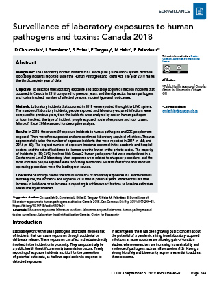 Choucrallah D, Sarmiento L, Ettles S, Tanguay F, Heisz M, Falardeau E. Surveillance of laboratory exposures to human pathogens and toxins: Canada 2018. Can Commun Dis Rep 2019;45(9):244–51. https://doi.org/10.14745/ccdr.v45i09a04
