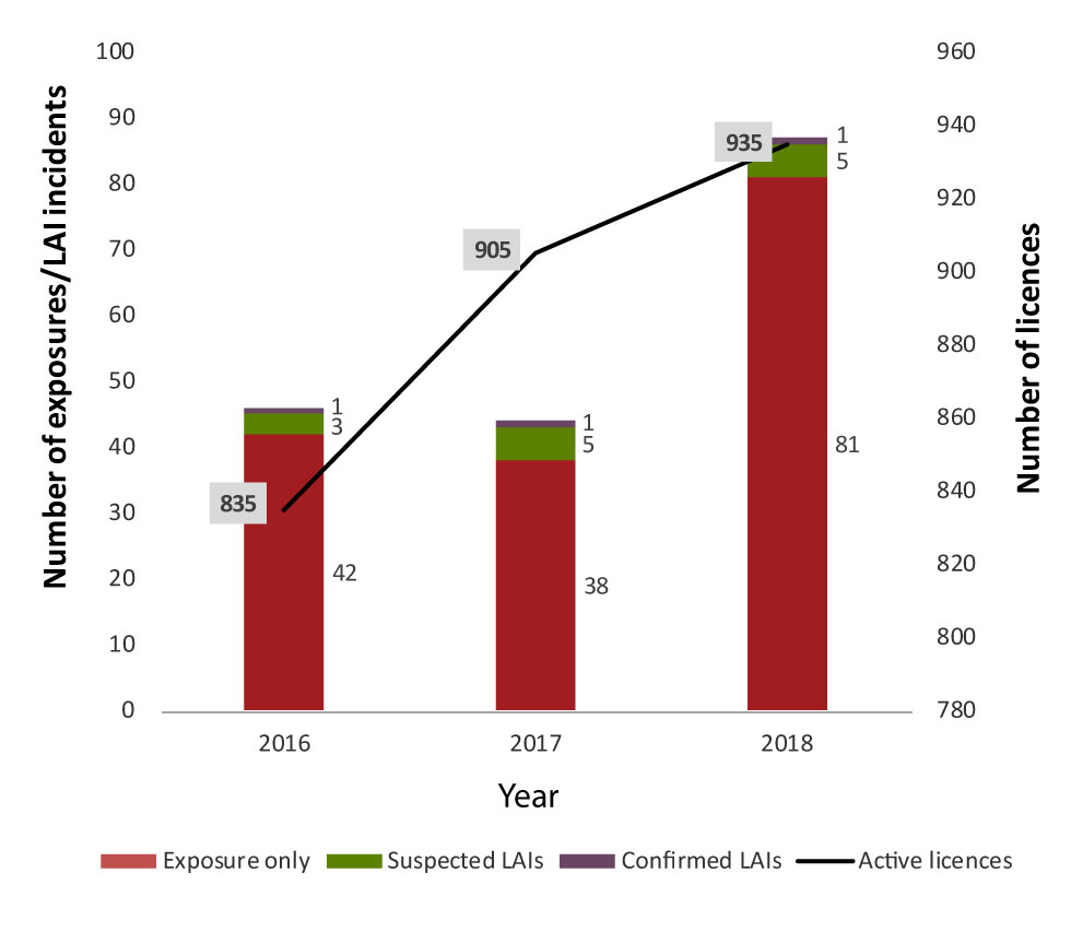 Figure 1: Reported exposure, confirmed and suspected laboratory-acquired infection incidents and active licences, Canada, 2016–2018