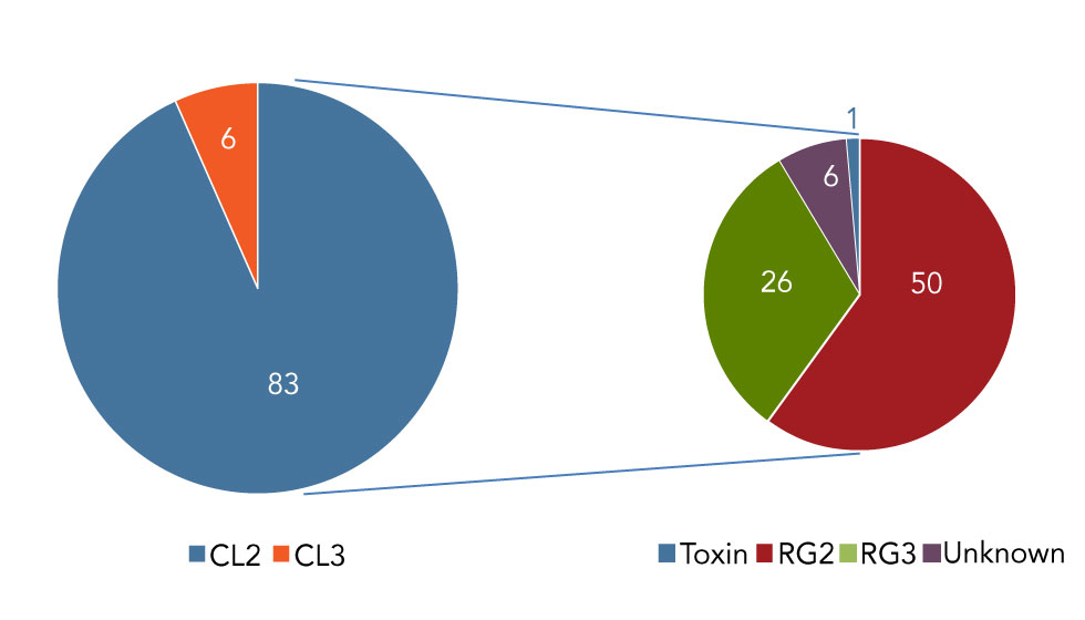 Most exposure incidents occurred in Containment Level (CL) 2 laboratories (n=83; 93%) and the rest occurred in CL3 (n=6; 7%). Most incidents that occurred in CL2 laboratories involved a RG2 pathogen (n=50; 60%) (Figure 3).