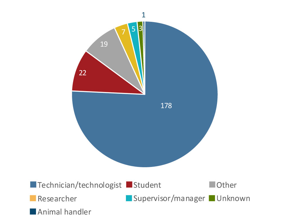 Technicians were involved in the highest number of laboratory exposures, but this might be because they represent the largest proportion of workers manipulating human pathogens and toxins. Technicians are present in all sectors, whereas animal handlers, for example, are not. Of laboratory workers, students had the most exposures incidents after technicians. Anecdotal evidence suggests that students in the academic sector may not be fully aware of or comply with laboratory procedures and safety measures, which may result in the high number of exposure incidents in this population.