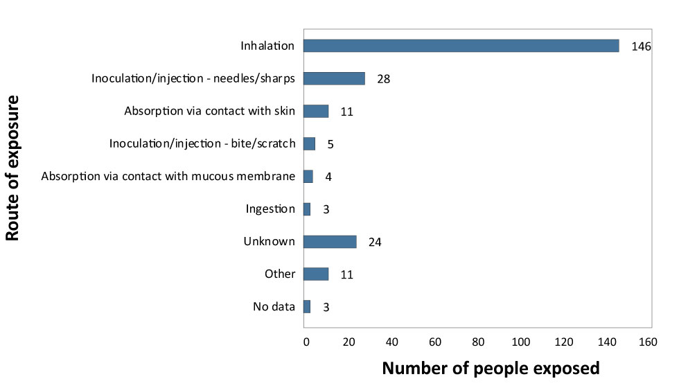 Of the 235 people exposed, the majority were exposed to pathogens or toxins through inhalation (n=146; 62%), while inoculation/injection of needles or sharps was the second most common route of exposure (n=28; 12%) (Figure 6).