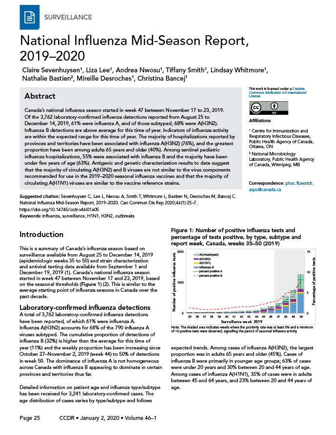 Sevenhuysen C, Lee L, Nwosu A, Smith T, Whitmore L, Bastien N, Desroches M, Bancej C. National Influenza Mid-Season Report, 2019–2020. Can Commun Dis Rep 2020;46(1):25–7. https://doi.org/10.14745/ccdr.v46i01a05