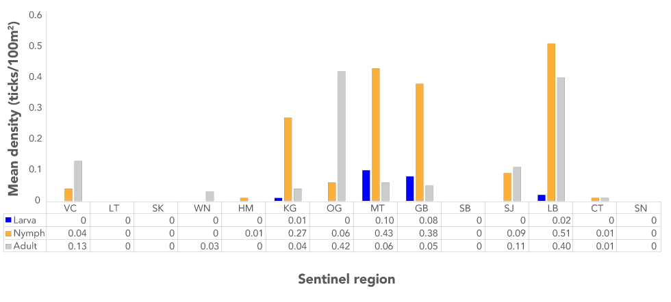 | Sentinel region | No. of sites visited (n) | Density (no. of nymphs/100 m2) | Standard deviation | ||