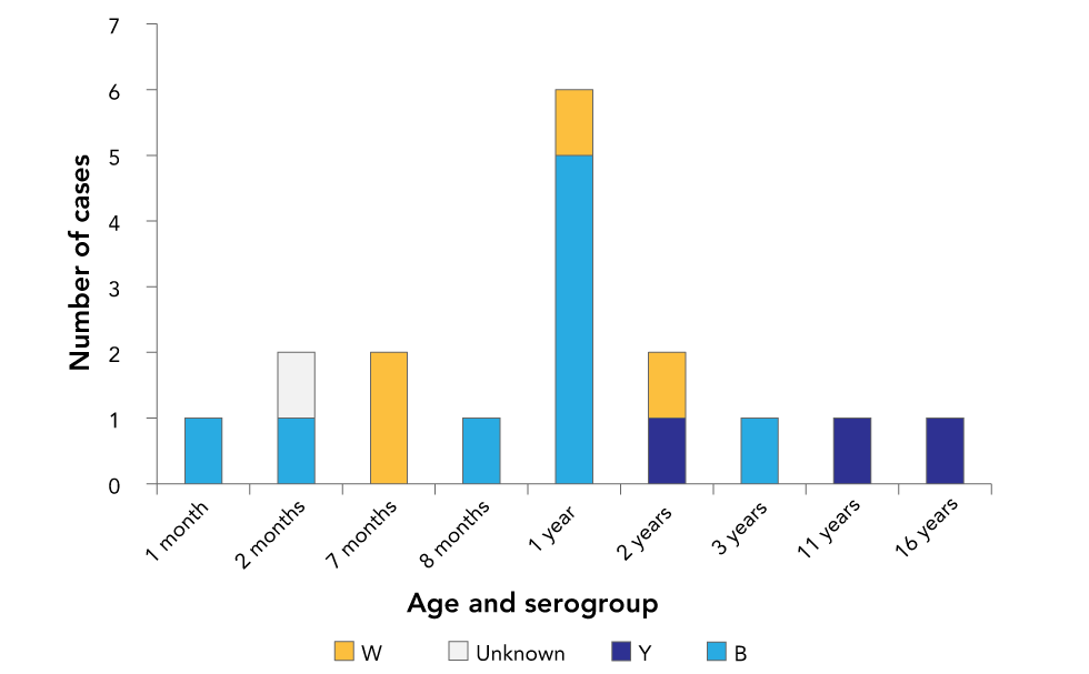 There was a single serogroup B case at one, two and eight months of age, five cases at one year of age and another single case at three years of age. For serogroup W, there were two cases at seven months of age and single cases at one year and two years of age. There were single serogroup Y cases at 2, 11 and 16 years of age. Serogroup was unknown for a single case at two months of age.