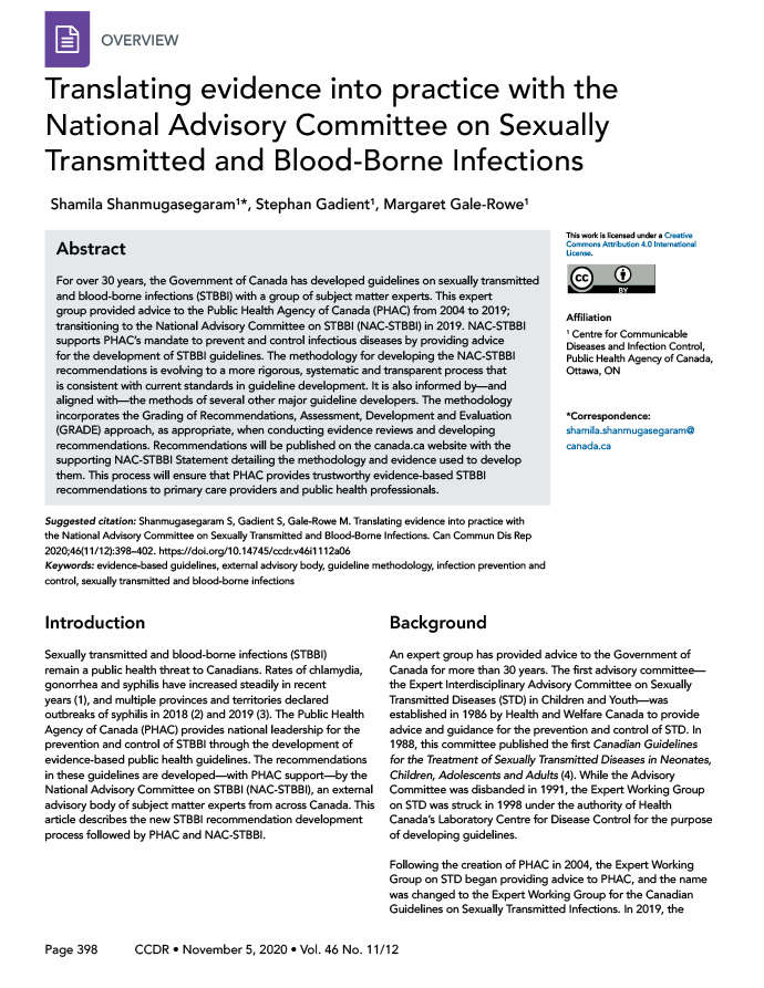 Shanmugasegaram S, Gadient S, Gale-Rowe M. Translating evidence into practice with the National Advisory Committee on Sexually Transmitted and Blood-Borne Infections. Can Commun Dis Rep 2020;46(11/12):398-402. https://doi.org/10.14745/ccdr.v46i1112a06