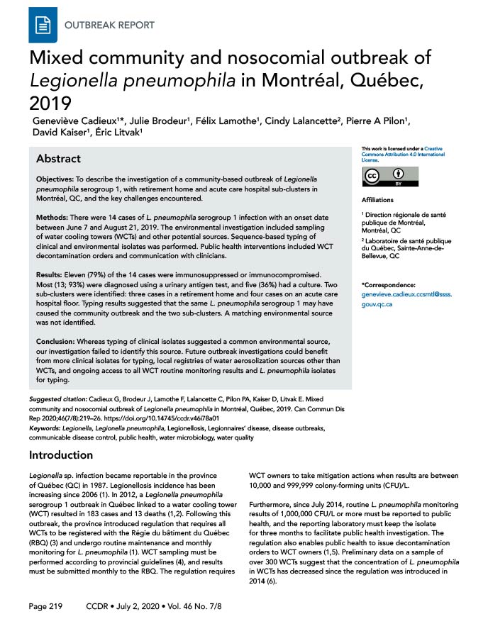 Cadieux G, Brodeur J, Lamothe F, Lalancette C, Pilon PA, Kaiser D, Litvak E. Mixed community and nosocomial outbreak of Legionella pneumophila in Montréal, Québec, 2019. Can Commun Dis Rep 2020;46(7/8):219–26. https://doi.org/10.14745/ccdr.v46i78a01