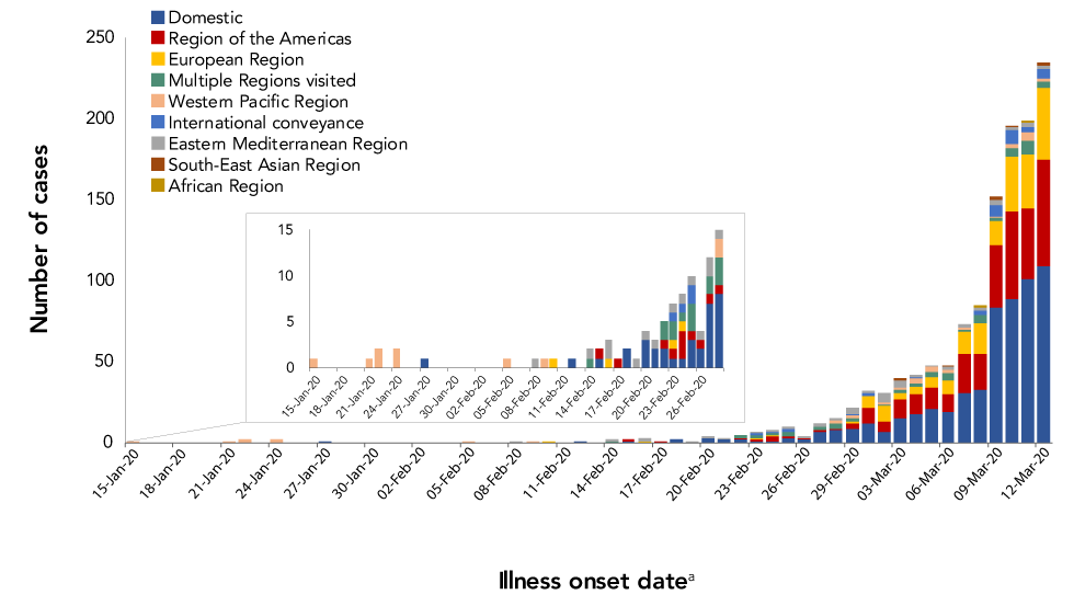 | Date of illness onset | African Region | Domestic | Eastern Mediterranean Region | European Region | International conveyance | Multiple Regions visited | Region of the Americas | South-East Asian Region | Western Pacific Region |
