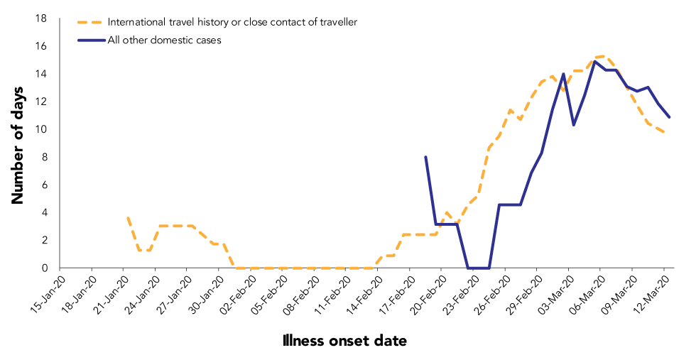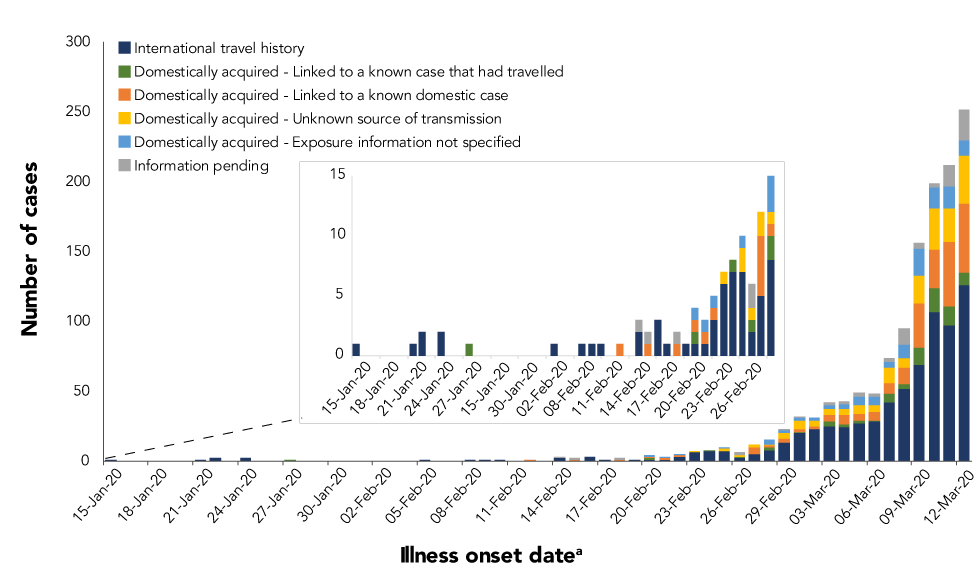 | Onset date | Domestically acquired - Exposure information not specified | Domestically acquired - Linked to a known domestic case | Domestically acquired - Linked to a known case that had travelled | Domestically acquired - Unknown source of transmission | Information pending | International travel history |