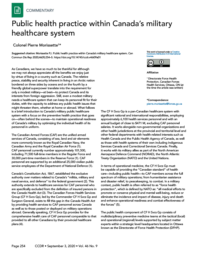 Morissette PJ. Public health practice within Canada’s military healthcare system. Can Commun Dis Rep 2020;46(9):254–5. https://doi.org/10.14745/ccdr.v46i09a01