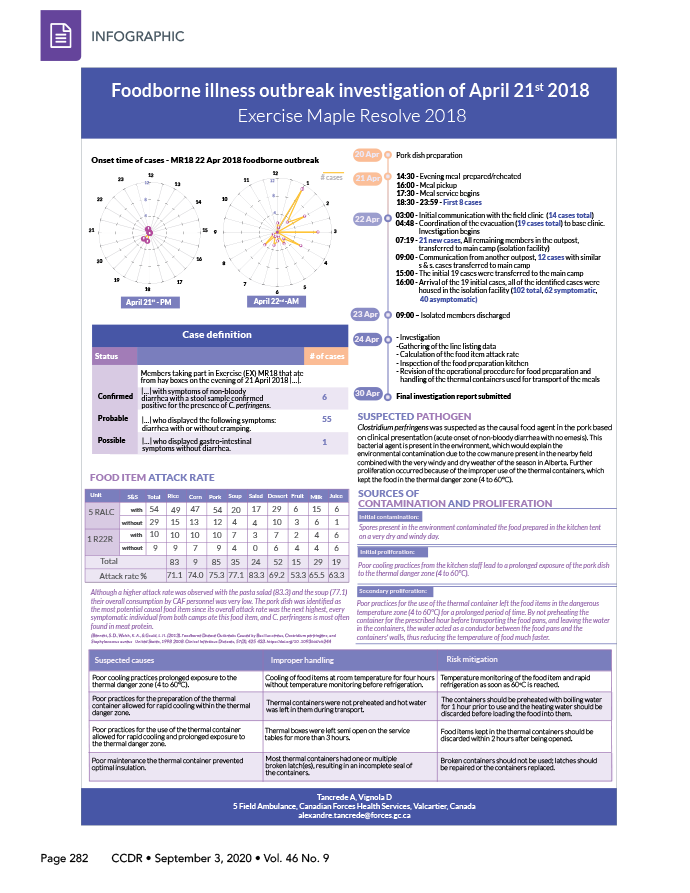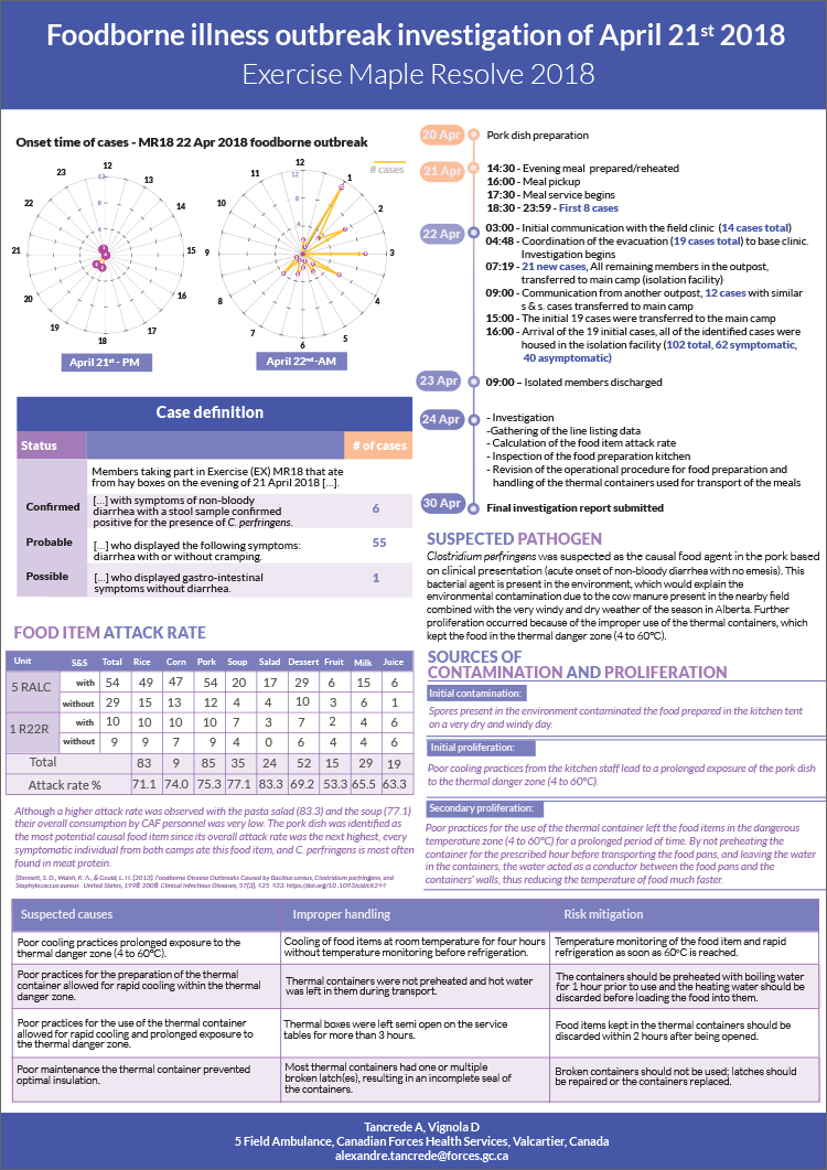 This infographic depicts the timeline of the outbreak; the case definitions; the information on the suspected pathogen; the food item attack rate; the sources of contamination and proliferation; the suspected causes; the improper handling and the risk mitigation of the foodborne illness outbreak of April 21st 2018, during Exercise Maple Resolve 2018.