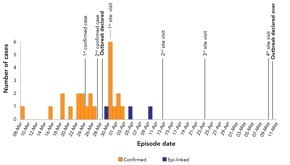 Figure 1: Epidemic curve of outbreak COVID-19 cases by episode dateFigure 1 footnote a, March 8 to May 11, 2020 (N=26)