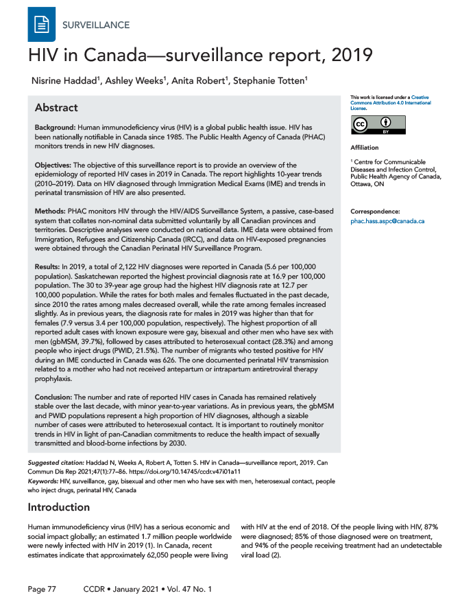 Haddad N, Weeks A, Robert A, Totten S. HIV in Canada—surveillance report, 2019. Can Commun Dis Rep 2021;47(1):77–86. https://doi.org/10.14745/ccdr.v47i01a11